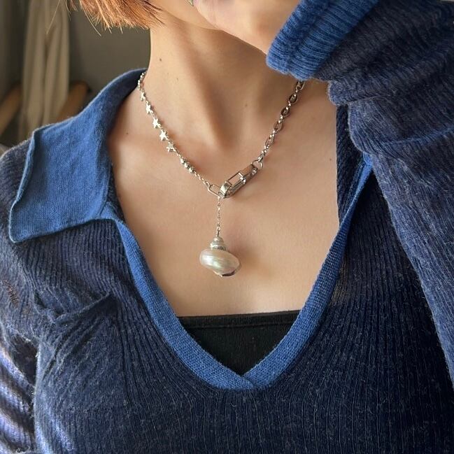 中央で大きく存在するシェルチャームを波が包み込むような、煌びやかな空気感を閉じ込めたnecklaceです。