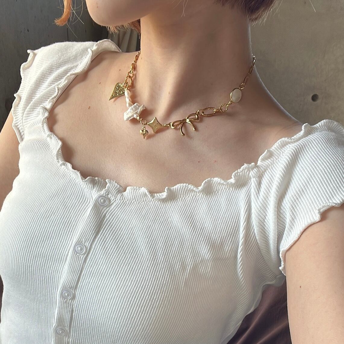 シンプルなチェーンにときめくチャームを入れ込み、手に取るだけで胸が高鳴るようなデザインに。