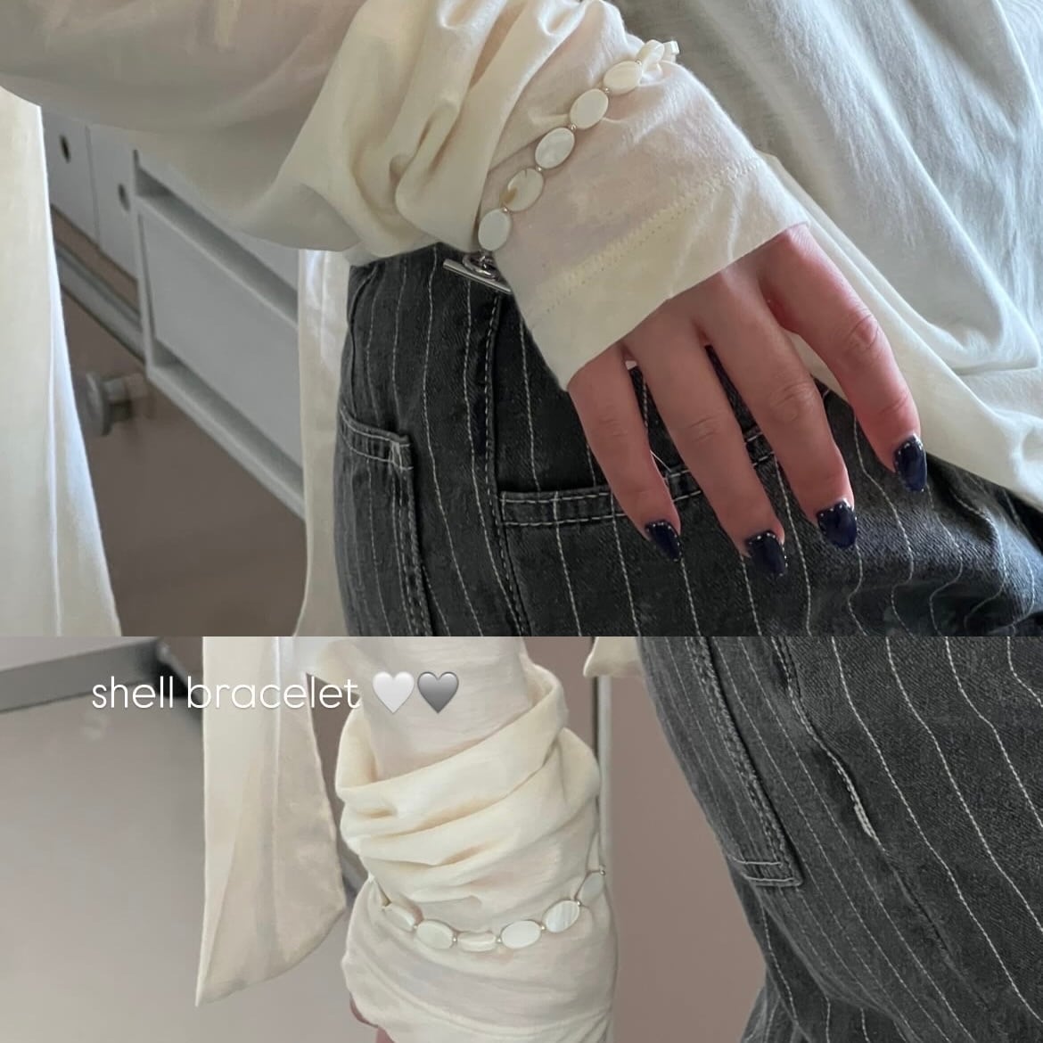 柔らかい色味のシェルパーツがお手元を華奢に彩るように。