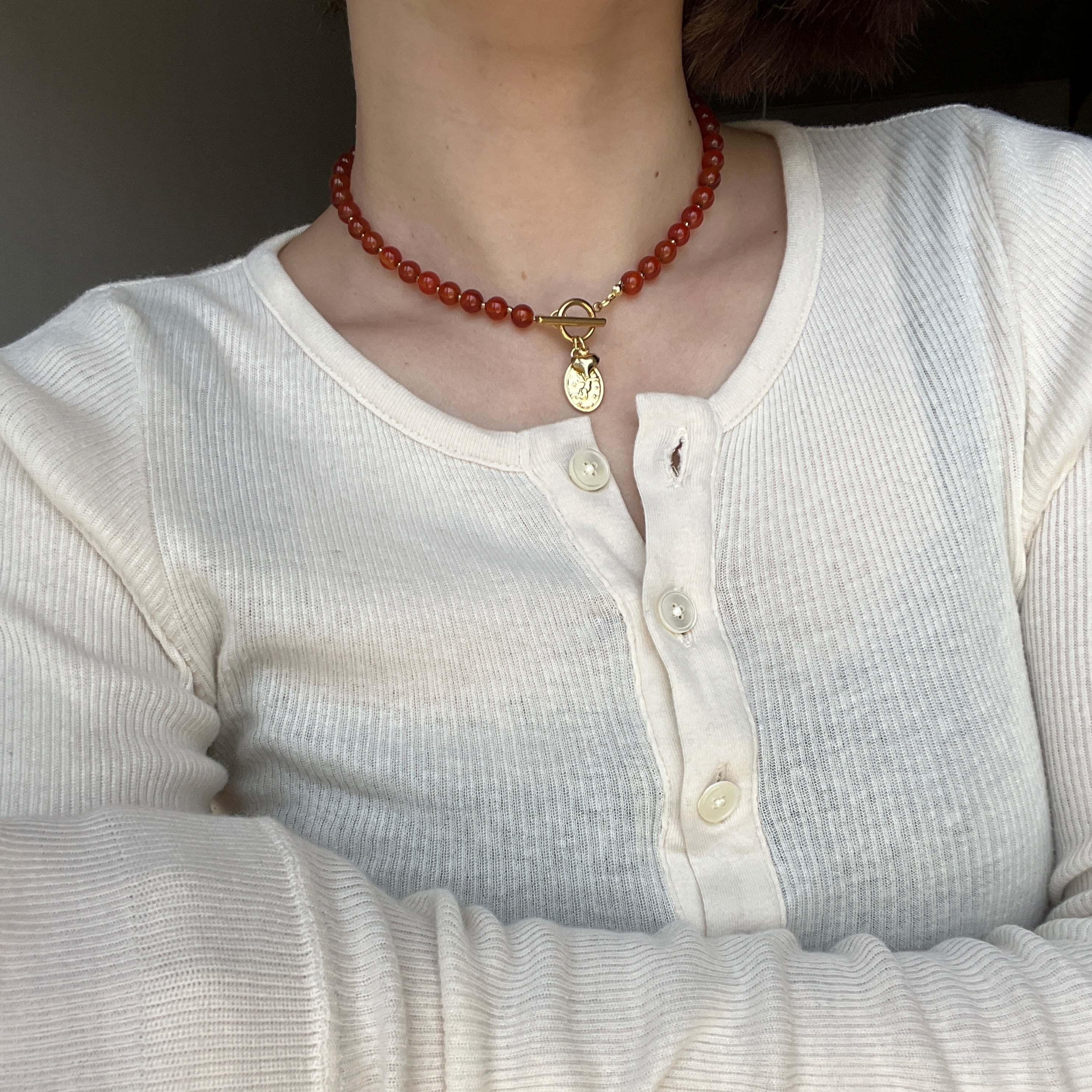 落ち着いたトーンの瑪瑙にlovelyなチャームを組み合わせて、気軽にみにつけられるアイテムに。