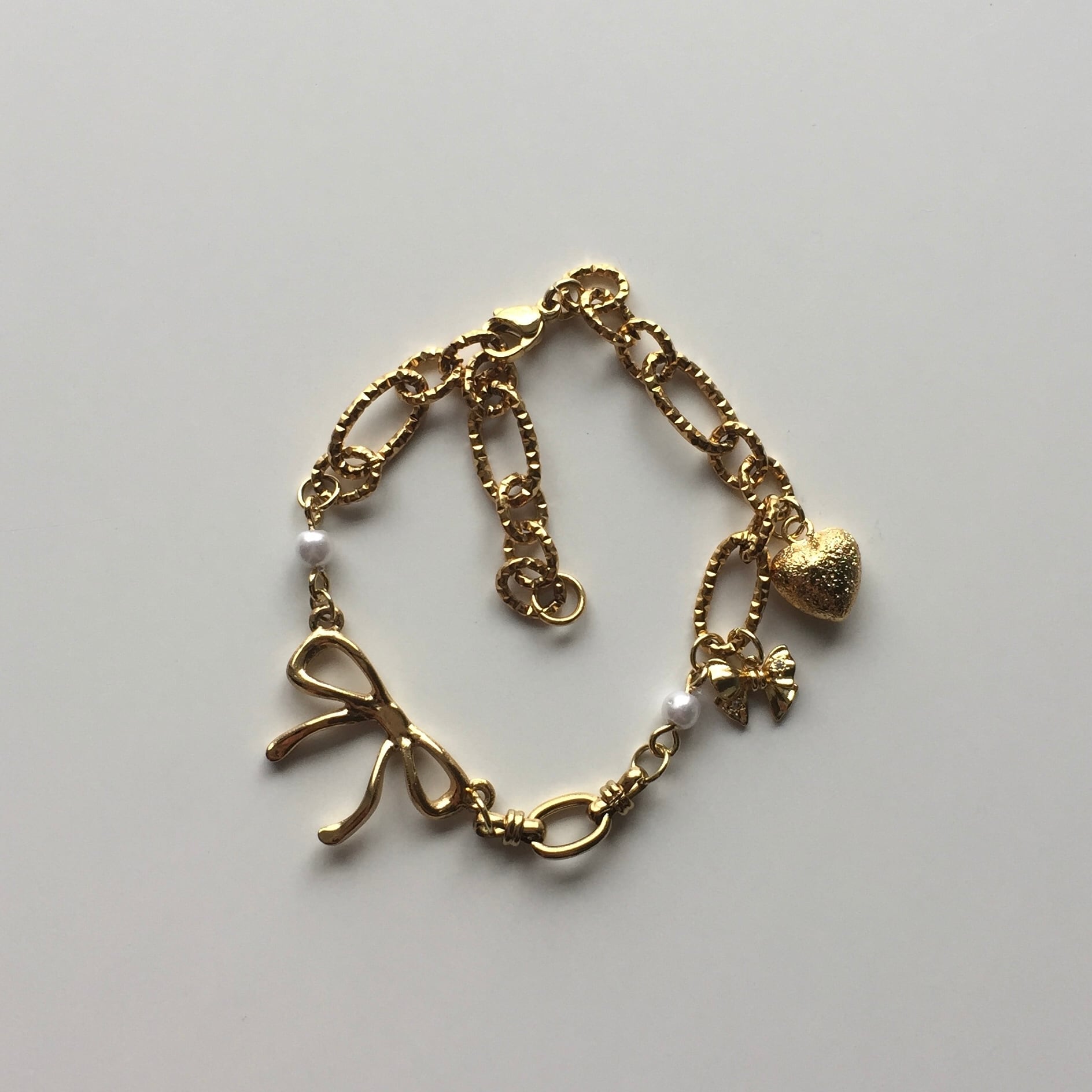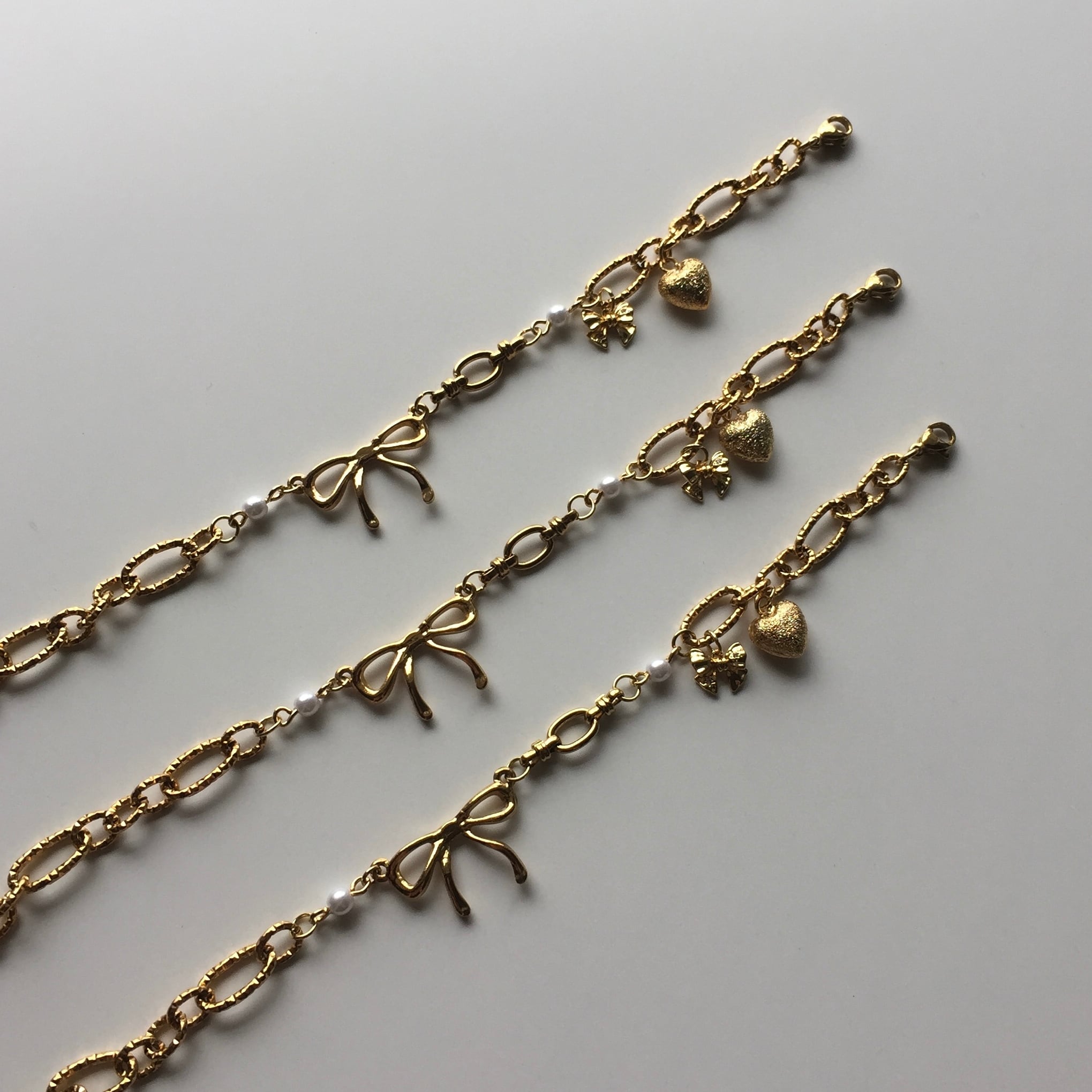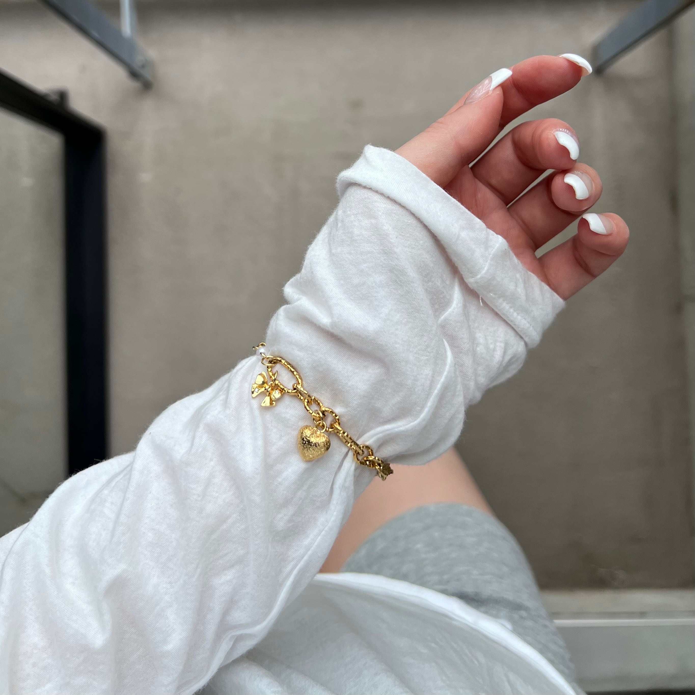 リボンやハート等のcuteなチャーム達が小さく揺れる、ロマンチックな雰囲気を纏うbracelet