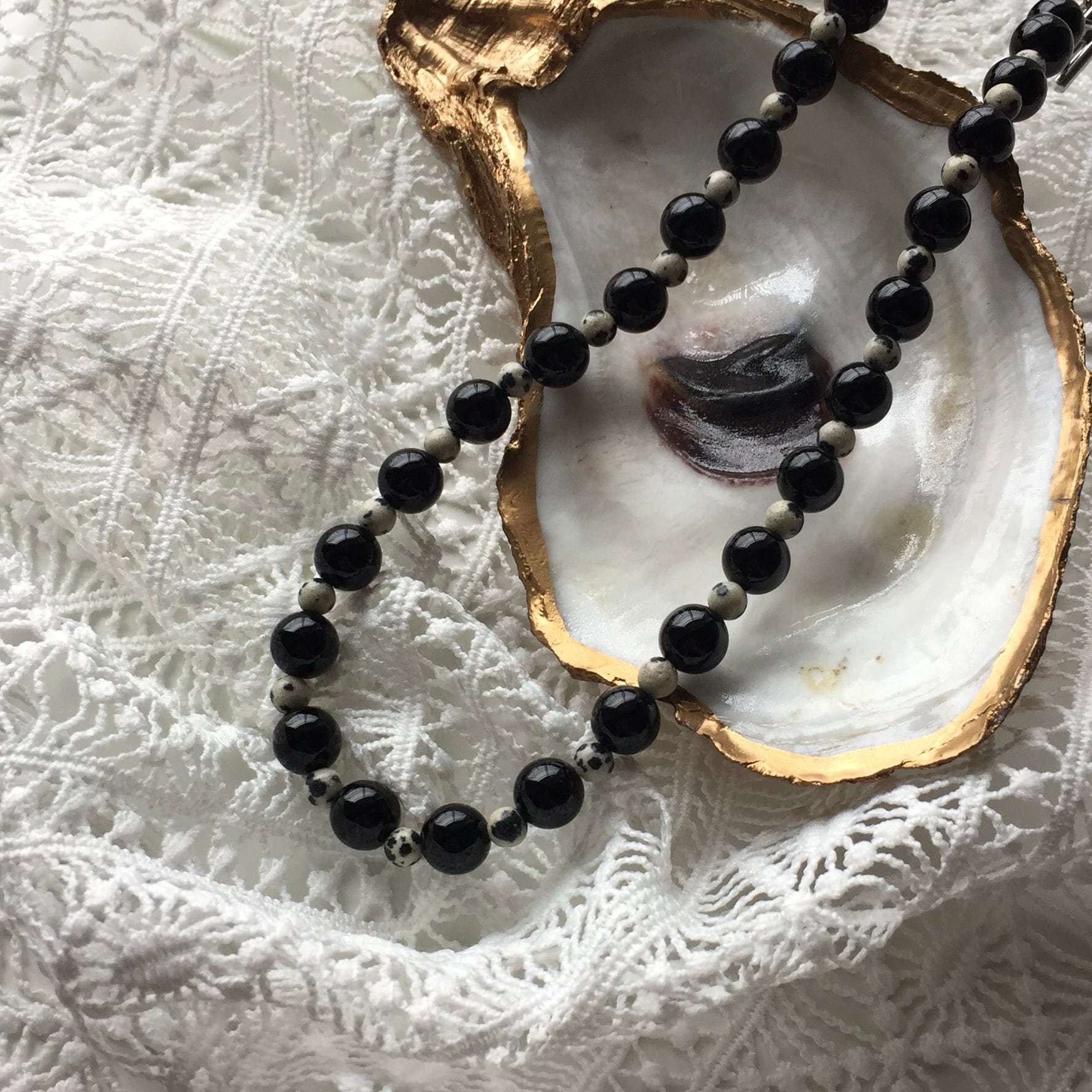 異なるサイズの天然石を組み合わせて可愛らしさも放ちつつも、どこか大人っぽく落ち着きを持って身につけられるデザインに。